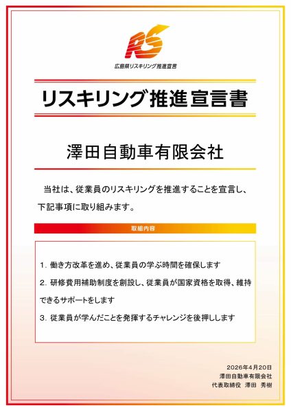 中古車販売士の在籍している事をはじめ、JU中販連が定める9項目の申請要件をすべて満たしている事が認定の条件となっており、中古車販売における数多くの法令やルールを正しく理解している事は勿論、徹底したお客様目線での対応に関する教育研修を修了しているため、お客様にとって、安心・信頼のお店選びの目印となるものです。